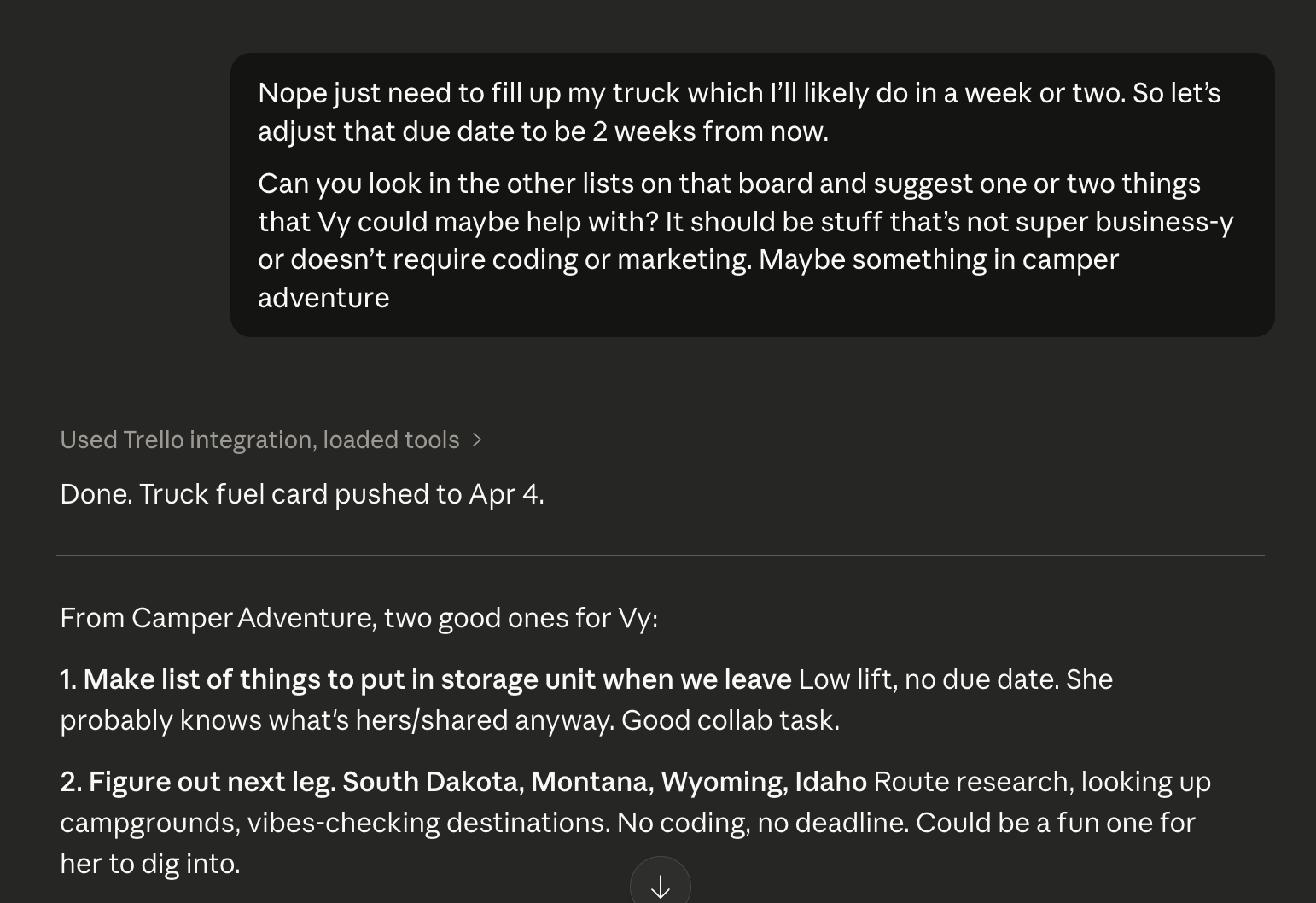 "What should I be working on next?" It looks across your boards, weighs due dates and context, and gives you a prioritized answer. Not magic, but surprisingly useful.