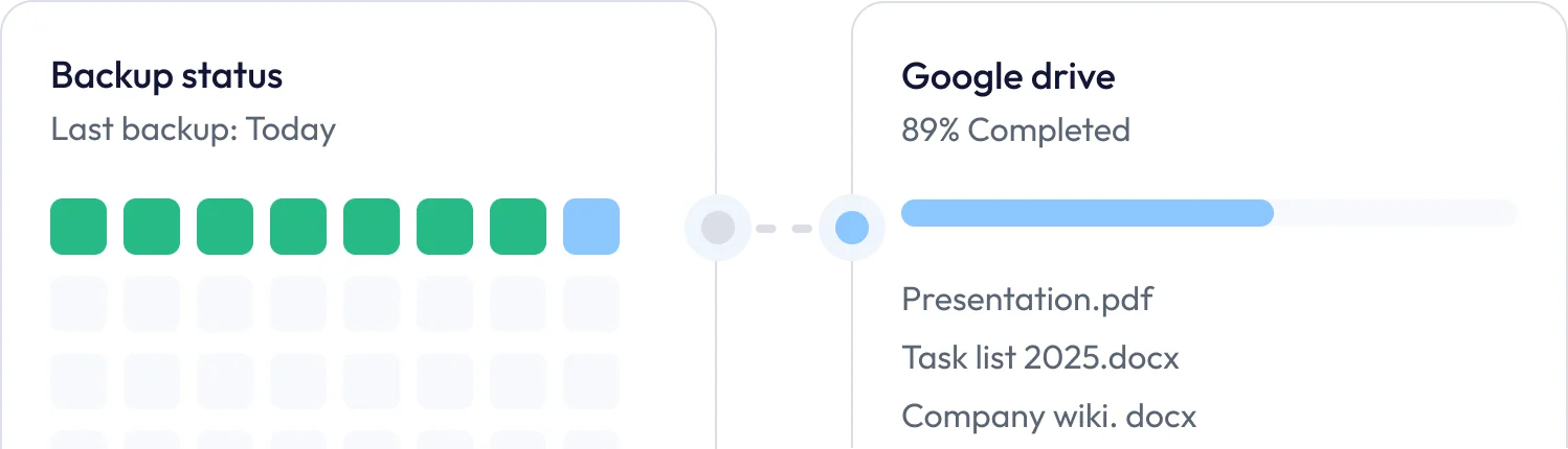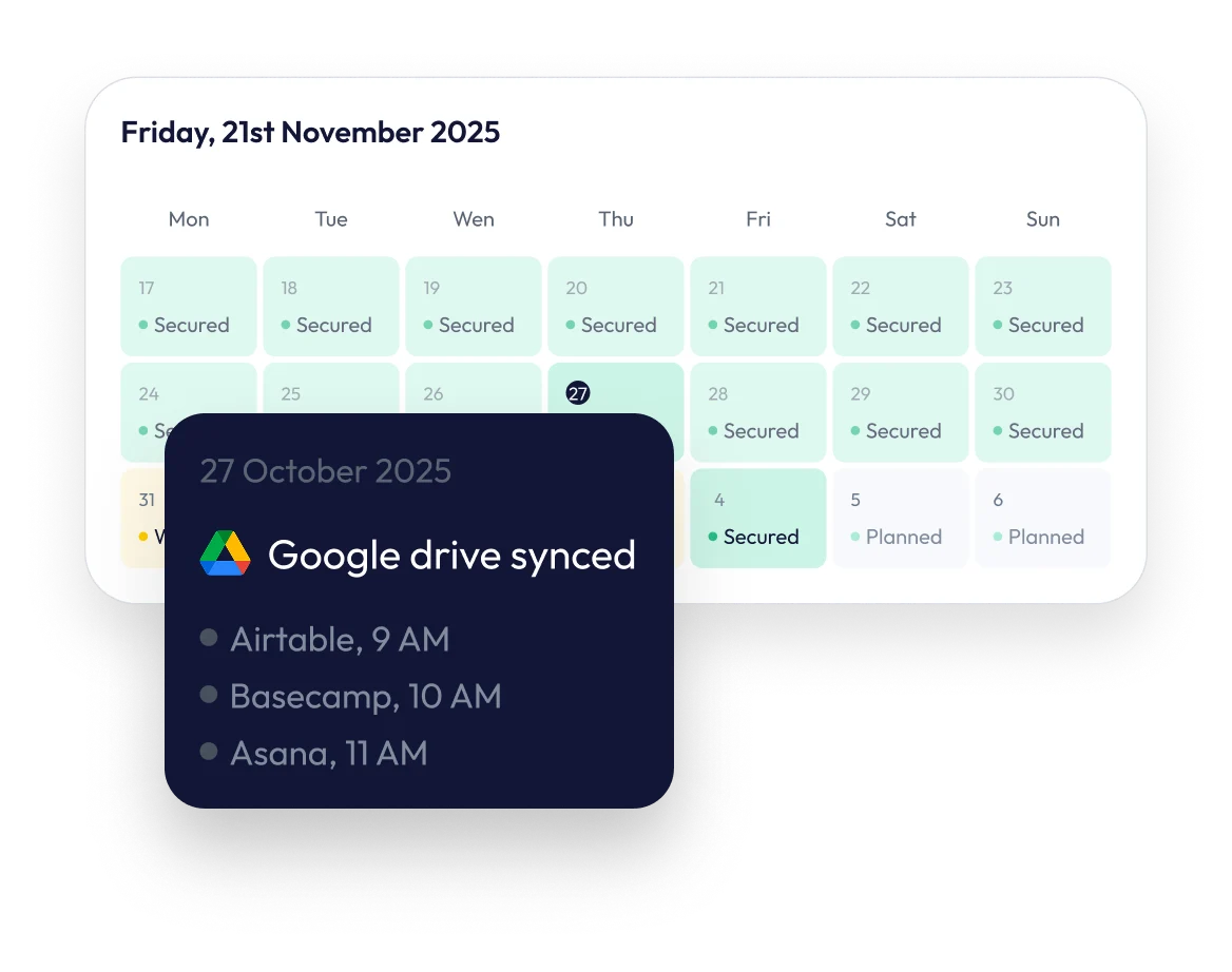 Backups are stored outside your primary SaaS provider, giving you an additional, fully independent safety layer you control.